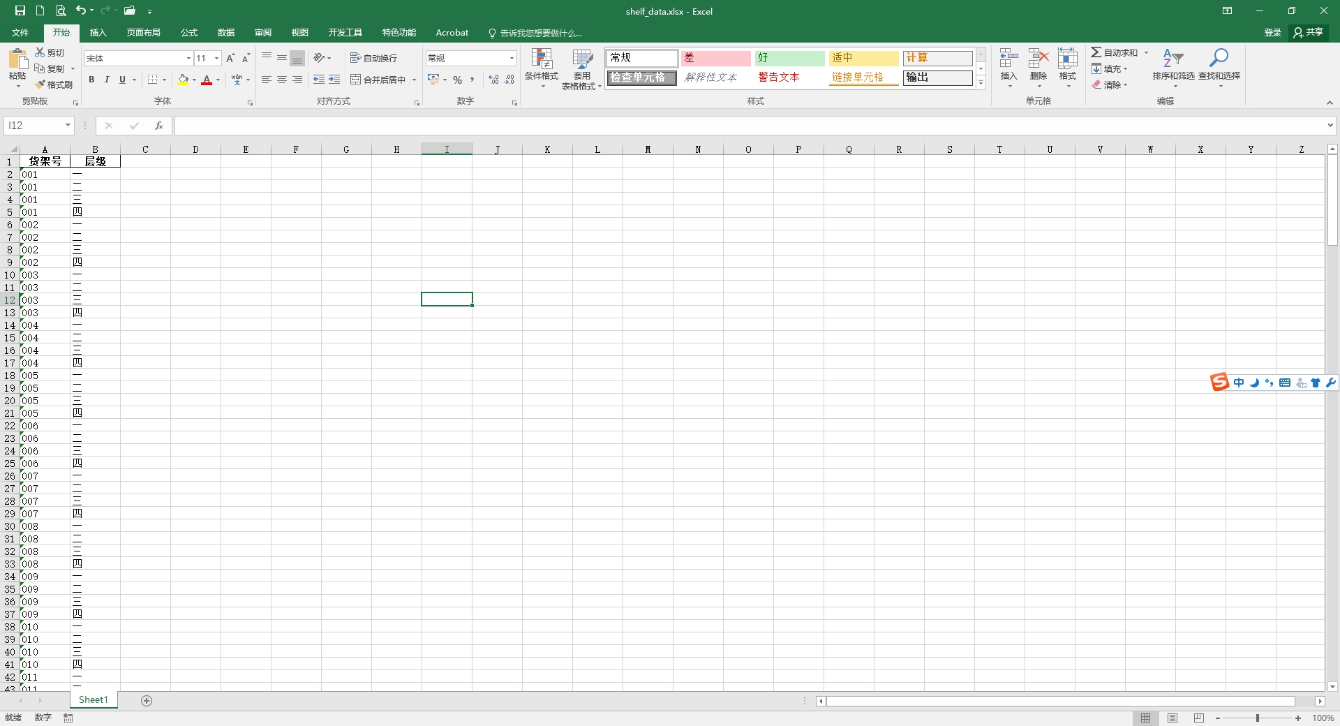 这个程序首先生成货架号和层级数据,然后将这些数据存储在一个Pandas DataFrame中,并最终将DataFrame保存为一个名为 shelf_data.xlsx 的Excel文件。运行这个脚本后,你会在当前目录下看到生成的Excel文件。